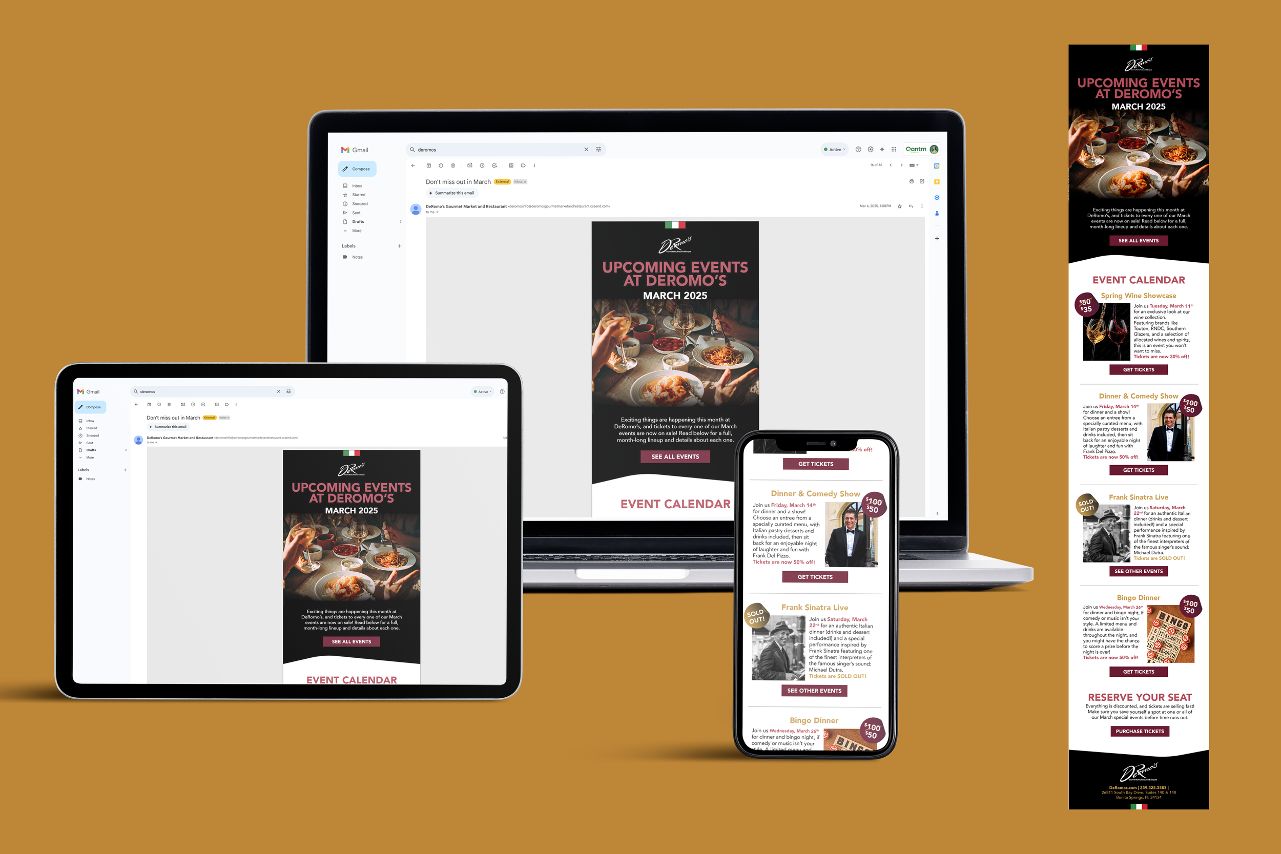 This eight-month long project involved creating a visual look from an established brand guide applied to two email campaigns per month aimed at highlighting different promotions such as discounts on market items, special catering opportunities, or monthly themed events. Over the course of this project, DeRomo’s saw a consistent 44% open rate across all email campaigns; 7% above industry average and a 10% increase from the previous eight months as well as a 2% click rate; 1.1% above industry average, and a 100% increase compared to the previous eight months.